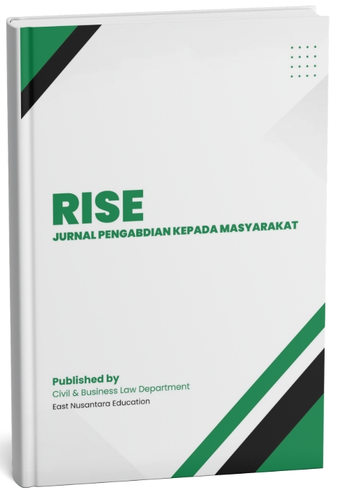 RISE: Jurnal Pengabdian Kepada Masyarakat merupakan jurnal akademik yang didedikasikan untuk mempublikasikan hasil-hasil penelitian, inovasi, dan praktik terbaik dalam bidang pengabdian kepada masyarakat. Jurnal ini bertujuan menjadi wadah strategis untuk menyebarkan pengetahuan dan pengalaman yang berfokus pada pemberdayaan, peningkatan kualitas hidup, serta solusi nyata atas berbagai permasalahan sosial dan lingkungan yang dihadapi masyarakat.